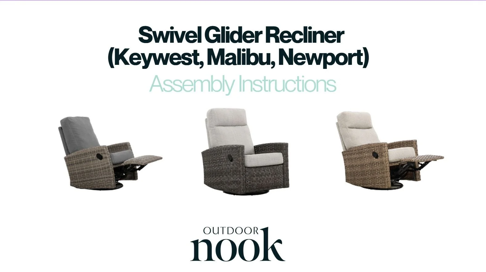 Assembly Instructions Skip to Videos All | Swivel Glider Recliner | Wicker Reclining Three-Seat Sofa | Wicker Loveseats | Stationary Sofas | Huntington Collection | Side Tables & Accessories | Huntington Recliner Assembly Instruction Swivel Glider Recliner, Outdoor Swivel Glider Recliners Assembly (general) Wicker Reclining Three-Seat Sofa, Wicker Three-Seat Recliner Sofa - Keywest, Malibu & Newport Wicker Loveseats, Wicker Loveseats with Console - Keywest, Malibu & Newport Wicker Loveseats, Wicker Loveseats - Keywest, Malibu & Newport Huntington Collection, Huntington Three-Piece Outdoor Aluminum Reclining Sofa Huntington Stationary Sofa Huntington Collection, Huntington Outdoor Aluminum Reclining Loveseat Sofa Stationary Sofas, Malibu 4-piece Patio wicker Modular Sofa with Ottoman Stationary Sofas, Malibu 3-piece Patio wicker Modular Sofa Wicker Loveseats, Stationary Sofas, Malibu 2-piece Patio wicker Modular Loveseat Couch with Console Stationary Sofas, Newport Stationary Three Seat Sofa Huntington Collection, Side Tables & Accessories, Huntington Cocktail Table Side Tables & Accessories, All-Weather Covers for all Sofas Side Tables & Accessories, Wosiac Outdoor Speaker Table